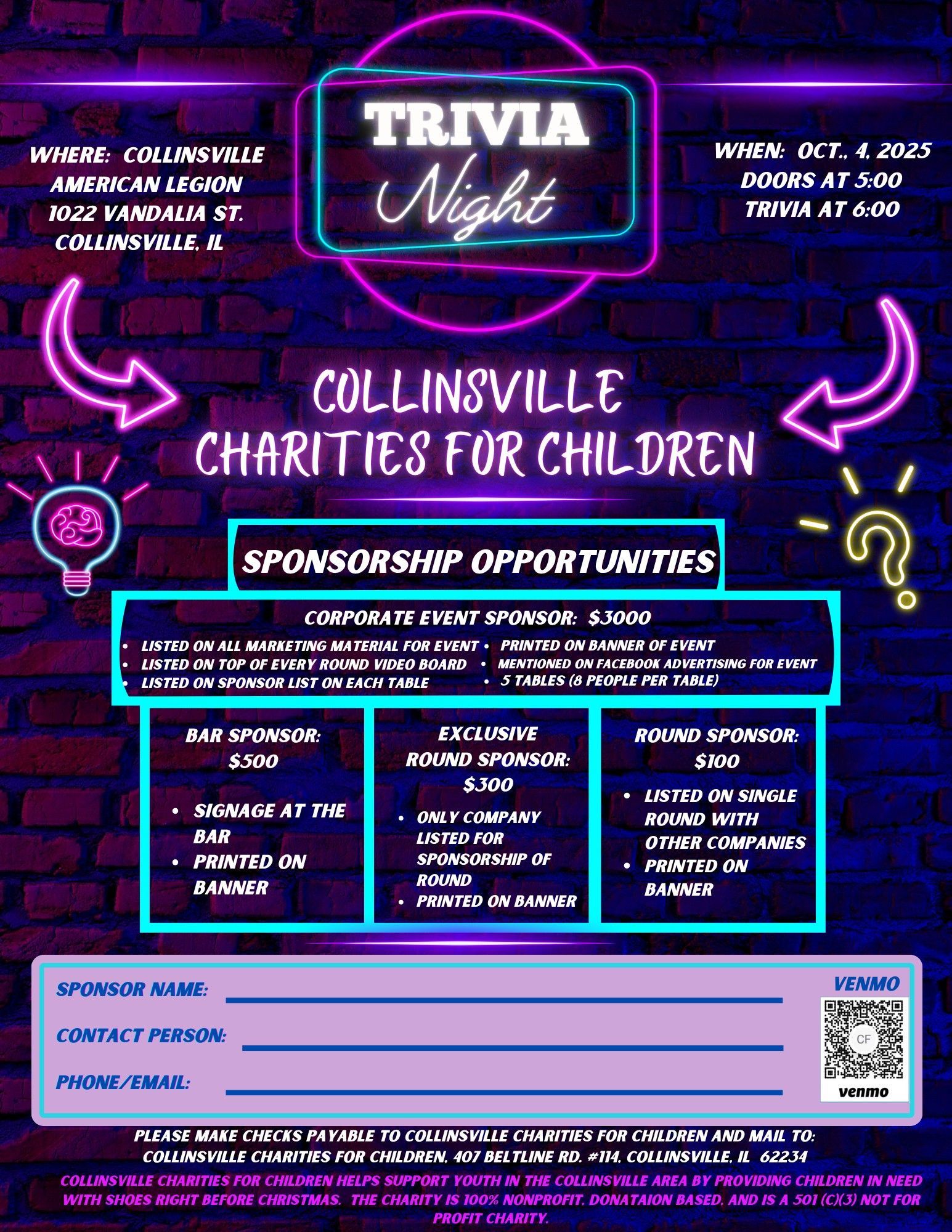 If you love trivia and want to give back to your community, our Charity Trivia Night is the perfect opportunity! Collinsville Charities for Children is a local not-for-profit group dedicated to providing shoes for children in need. A major part of our fundraising efforts is our annual Trivia Night, held at the Collinsville American Legion. Gather your team, enjoy raffles, auctions, and refreshments, and help us provide brand-new shoes for local kids. To get involved, please contact our head office in Collinsville, IL, via this website.